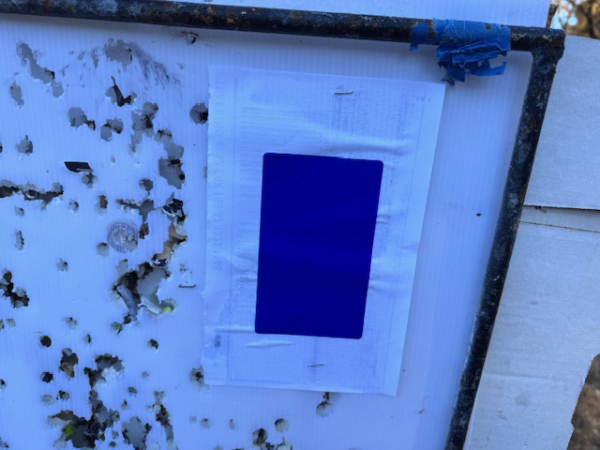 The target was a half-sheet of printed paper in “portrait” orientation (8 ½” high x 5 ½” wide). On the center of the paper, more-or-less, I affixed a 3” x 5” shipping label in the same orientation.