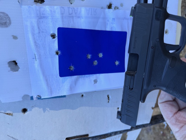 With the Springfield Hellcat Pro, I loaded rounds in the same random way. After shooting, I found that I had six hits on the 3x5 label, three on the page off the label, including a nick at 11 o’clock. The group wasn’t as tight as the RXM - but it’s a smaller gun.