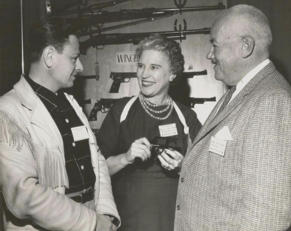 Flora Van Orden, wearing a Berns Martin shoulder holster, showing a customer her J-frame S&W while the General (r) looks on.