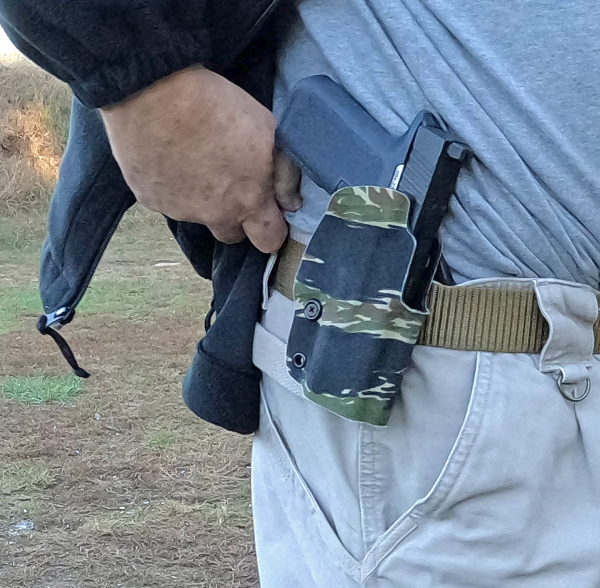 The holster worked as expected with both guns; in fact, it was so transparent that I didn’t really make a lot of notes on it. It suffices to note that under the just-over-waist length jacket, I couldn’t raise my arms much before the bottom of the holster would show. Likewise, wearing it too far forward could create an unintended exposure of the gun.
