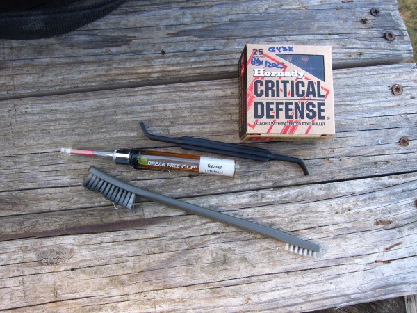 From a previous cleaning of different firearms, the Channel Cleaning Tool is in the middle – where it belongs as it’s a handy way to clean out slide-frame rails and elsewhere on those grungy firearms.