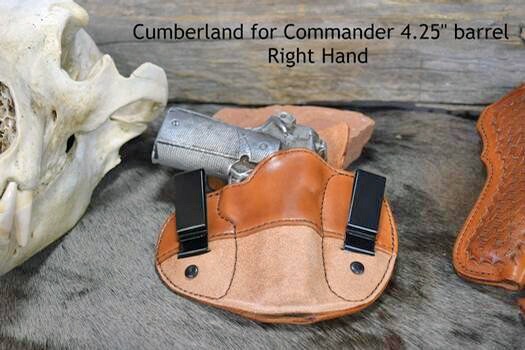 Their Cumberland - Leather Concealed Carry Holster is a pancake design with a reinforced mouth, metal clips to attach to the belt and an open bottom to allow ash & trash to fall through. It’s of the general format of the hybrids in terms of weight distribution on the belt.