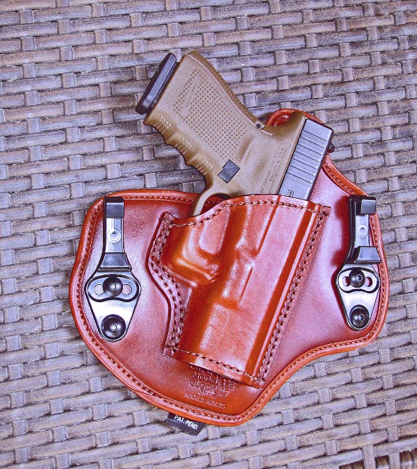 In response, he showed a battered, worn-out hybrid inside-the-waist holster. It consisted of a large sheet of cow-hide to which a kydex pouch had been attached. In addition, two steel clips, reminiscent of IWB clips from the 1960s-1970s, were attached at the extreme forward edge- and trailing edge of the cowhide sheet.