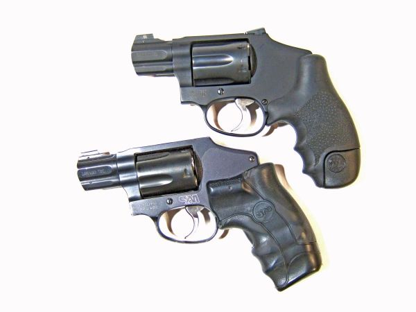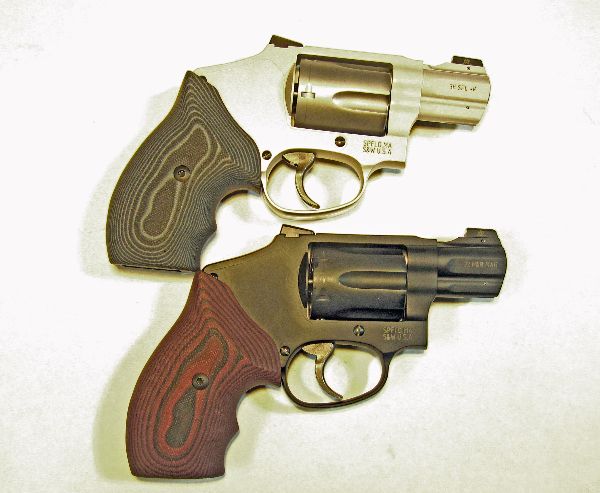 The new S&W Black Rubber UC High Horn stocks above as they appear on the S&W M&P340. Below, a pair of UC revolvers with the harder, less forgiving VZ Grips high horn stocks.