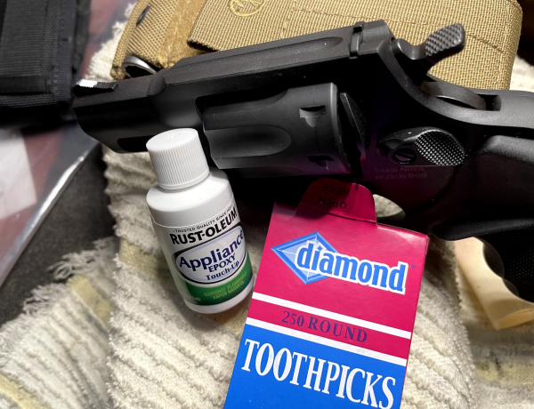 For the ballistics stuff to work out operationally, you can’t afford to miss. That means you need sights you can see. Following the (previously published) advice of Claude Werner, the Tactical Professor, I got some appliance touch-up paint and sorted out the hard-to-see (and otherwise just fine) sights of the Taurus M942 rimfire trainer snub revolver. While my painting technique wins no prizes, I can now see the front sight against a darkly colored target. You can also find Claude’s work here.