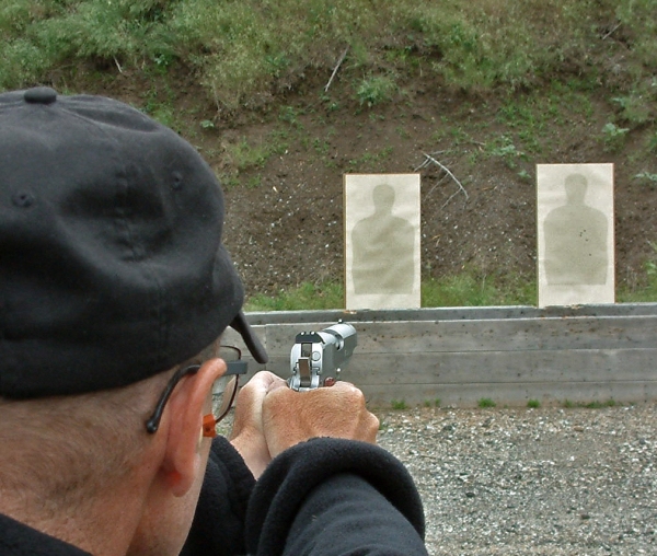 Okay. Put the fuzzy part over the 10-ring of that B-8 and keep the gun still as you can while you roll that trigger back.