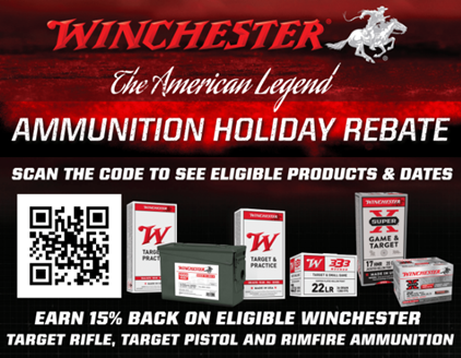 Winchester launches a holiday rebate for Black Friday where consumers can earn 15% back on eligible Winchester target rifle, pistol, and rimfire ammunition. The maximum rebate amount for each category is $50, minimum purchase of one box, and all pack sizes and configurations are eligible. The offer is valid on qualifying purchases made between November 20, 2025 – December 5, 2025. Eligible products include: