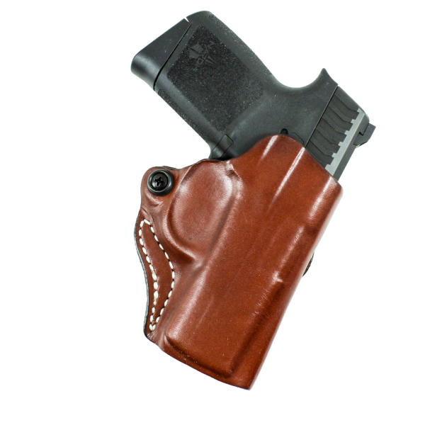 This is a barebones minimum IWB holster built from black saddle leather. The precise molded contours provide the weapon retention. The top is reinforced to ease re-holstering and the powder coated spring clip secures it to your belt. It is only available in black saddle leather in both right and left-hand models. MSRP price is $41.99