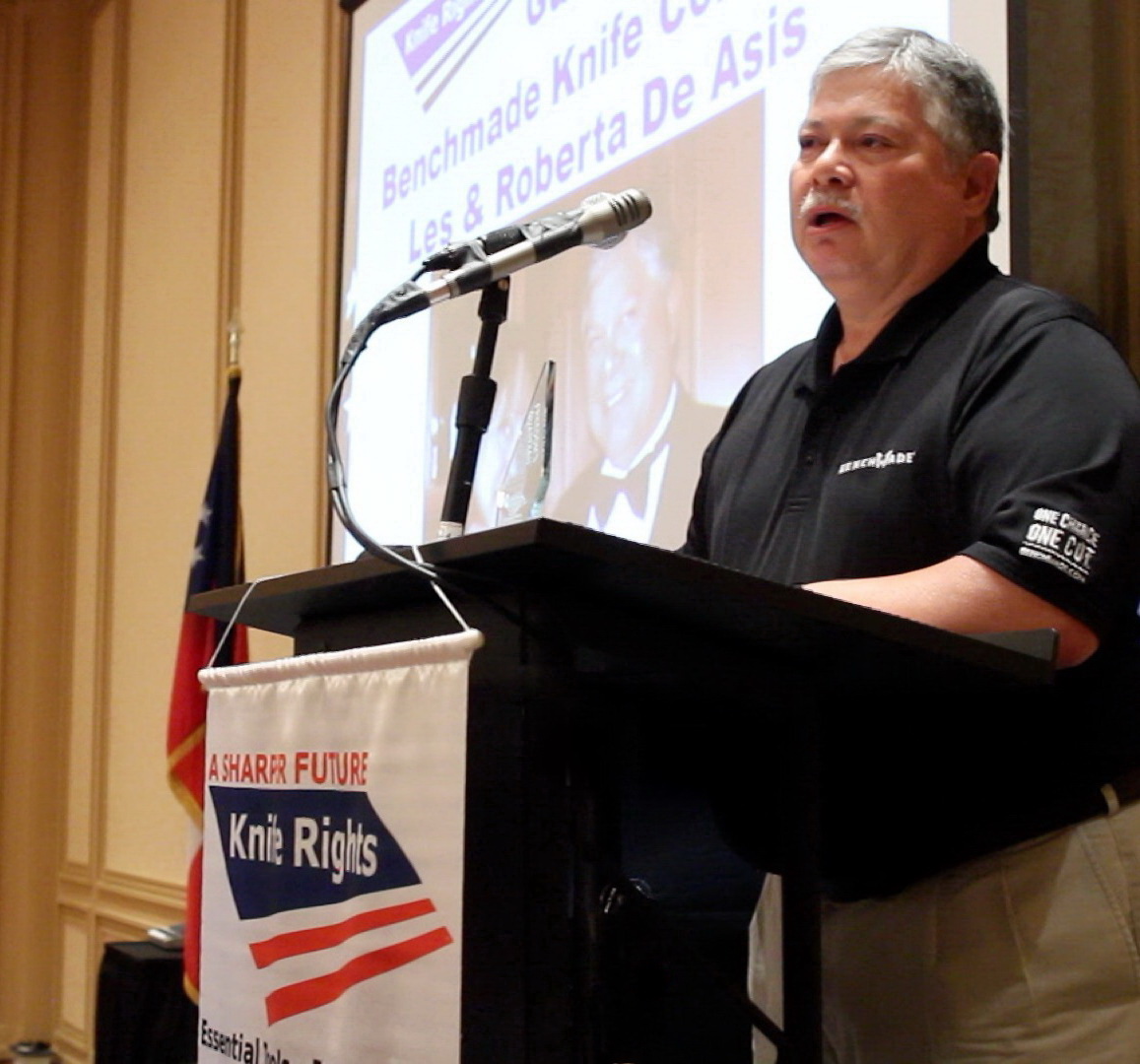 Upon receiving the award, Mr. DeAsis challenged his colleagues in the knife industry to support Knife Rights, saying, "We need to protect our future. Our needs and desires are all aligned. The money is a small price to pay for protection of our future, our children, our employees, our friends...it is absolutely critical that we step up. The bottom line is that I ask everybody to reach into your hearts, reach into your conscience, then reach into your wallets and make this go. Doug is working his tail off. He is committed, they are successful. There is absolutely no excuse for those people in this room and this industry not to support this organization because they are insuring that we can continue to do what we love to do... It is ensuring the future of this industry. It is critical that you stand up, that you reach into your pockets. Join Benchmade in supporting Knife Rights."