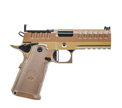 The new APACHE COMMANDER double-stack 1911 is expertly precision-machined with a robust stainless-steel frame, slide, and barrel. It is designed for performance and features tactical-profile grips, a flared double-stack magwell, a user-adjustable trigger duty-tuned to 4.5-5.5 lbs., and ambidextrous safety controls for enhanced versatility. Coated with industry-leading coating technologies for excellent lubricity and durability, it delivers exceptional corrosion resistance, even in harsh environments, and ensures effortless maintenance. The 4.1-inch barrel features a 1:16 twist, and the handgun weighs 35.8 oz. (unloaded w/Magazine). Lastly, the APACHE COMMANDER is available in two colorways: Black or Flat Dark Earth (FDE).