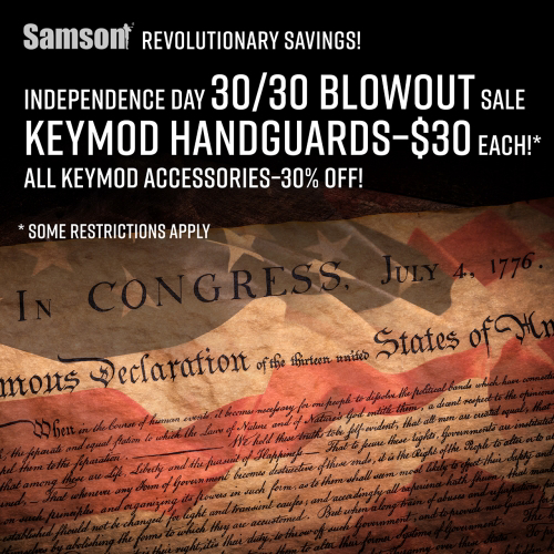 Keene, NH – Celebrate Independence Day with These Revolutionary Savings. Now through Sunday, July 7, ALL Samson KeyMod handguards are ONLY $30 each*, while supplies last. This crazy discounted price includes all sizes of the SX, SXS, and Evolution KeyMod handguards. And why not add some accessories to your KeyMod handguard—ALL KeyMod accessories are 30% off!